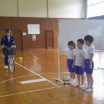 4月27日(月)、交通安全教室を行いました。3年生は、自転車の正しい乗り方について学習しました。まずは教室で、交通ルールや自転車に乗る前の点検ポイントについて説明を受け、その後、体育館で実演しました。左右の安全確認や一時停止など、一つひとつの動作を真剣に確認する姿が見られました。ご家庭でも自転車に乗る際は、ヘルメットを正しく着用し、車に十分気をつけて、安全に運転してほしいと願っています。