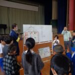 社会科「残したいもの 伝えたいもの」の学習の一環で、「桑原区のしゃぎり」について講師ノ先生をお招きして学習しました。4年生には、しゃぎりを習っている児童が4人おり、最初に演奏をしました。友達の前で演奏する姿は、誇らしげでかっこよかったです。次にしゃぎりの歴史と桑原区でしゃぎりが行われるようになった経緯についてお話を聞きました。最後に全員がかねをもち、先生の指導にしたがってしゃぎりました。